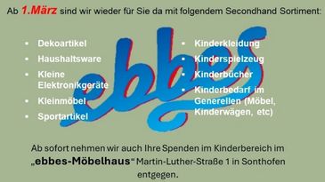 Unser Dienstleister steht Ihnen weiterhin zur Verfügung für Entsorgungen/Wohnungsauflösungen/Umzüge. Für nähere Infos wenden Sie sich gerne an das Team unseres Ebbes Kaufhaus Martin-Luther-Straße gerne auch per Mail unter der ebbes@oha-sonthofen.infooder telefonisch immer erreichbar zu den Öffnungszeiten unter der 08321/ 6076298.